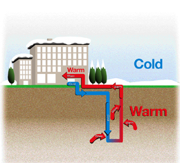 空調本身是一種能量轉移運輸的工具,在運行時熱泵機組隻需要付出較小的能量投入即可吸取存儲在地下的大量能量。