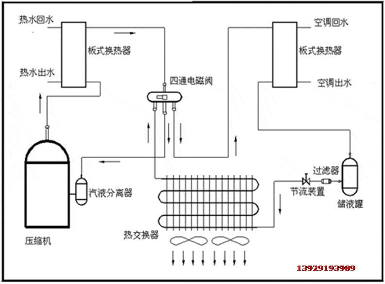 當冬季運行製熱時,通過熱回收側換熱器水泵的開、關,實現製熱、製熱+熱水。