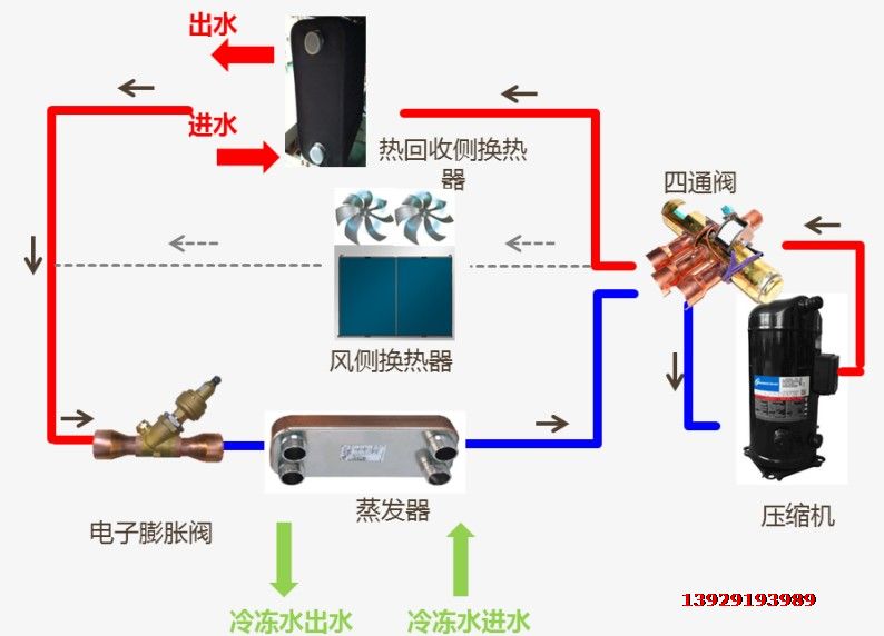 當夏季運行製冷時,通過熱回收側換熱器水泵的開、關,實現製冷、製冷+熱回收。