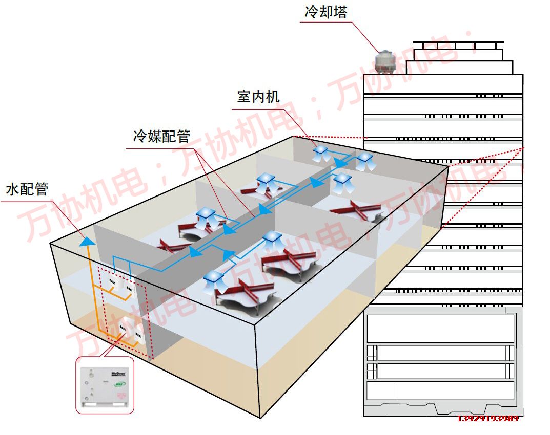 水(shui)冷(leng)多(duo)聯(lian)係(xi)統(tong)以(yi)水(shui)作(zuo)為(wei)冷(leng)熱(re)源(yuan),無(wu)需(xu)與(yu)外(wai)部(bu)空(kong)氣(qi)進(jin)行(xing)換(huan)熱(re),機(ji)組(zu)內(nei)置(zhi)高(gao)效(xiao)換(huan)熱(re)器(qi),主(zhu)機(ji)結(jie)構(gou)小(xiao)巧(qiao)緊(jin)湊(cou),可(ke)將(jiang)主(zhu)機(ji)安(an)裝(zhuang)在(zai)建(jian)築(zhu)物(wu)內(nei)部(bu),可(ke)輕(qing)鬆(song)應(ying)對(dui)玻(bo)璃(li)外(wai)觀(guan)的(de)需(xu)求(qiu)。按(an)照(zhao)水(shui)源(yuan)的(de)循(xun)環(huan)方(fang)式(shi)不(bu)同(tong),水(shui)冷(leng)多(duo)聯(lian)係(xi)統(tong)可(ke)以(yi)分(fen)為(wei)水(shui)環(huan)式(shi)水(shui)冷(leng)多(duo)聯(lian)係(xi)統(tong)和(he)水(shui)/地源式水冷多聯係統。前者以冷卻塔、鍋爐組成的環路提供冷熱源,並且回收建築內餘熱為主要特點,後者則以地表水、地下水、土壤源、海水、城市汙水等可再生能源作為冷熱源。