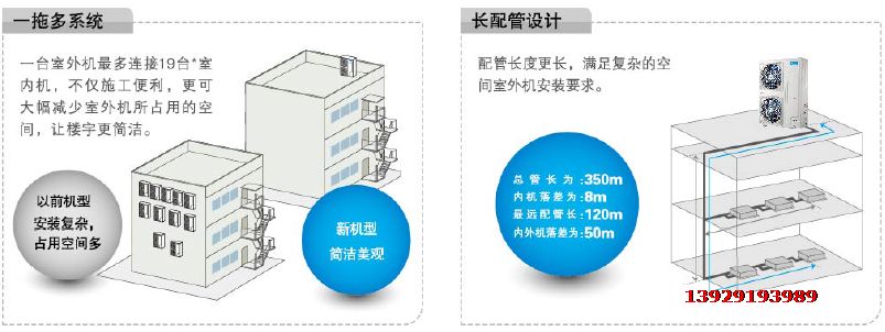 配管長度更長,滿足複雜的空間室外機安裝要求,總管長為350米,內機落差為8米,最遠配管長120米,內外機落差為50米