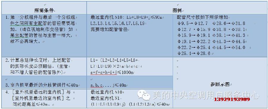 注:1.分歧管折算長度為等價配管長度0.5m。 2.內機盡量均等地安裝在U型分歧管的兩邊。 3.當外機在上的場合且落差超過20米,建議在主管的氣管上每隔10m設置一個回油彎。 4.當外機在下時,H≥40m主管與液管需加大一號。 5.連接到室內機的第一個分歧管組件的允許長度應等於或小於40m。但當下列條件全部滿足的情況下,允許長度可以延長為90m。